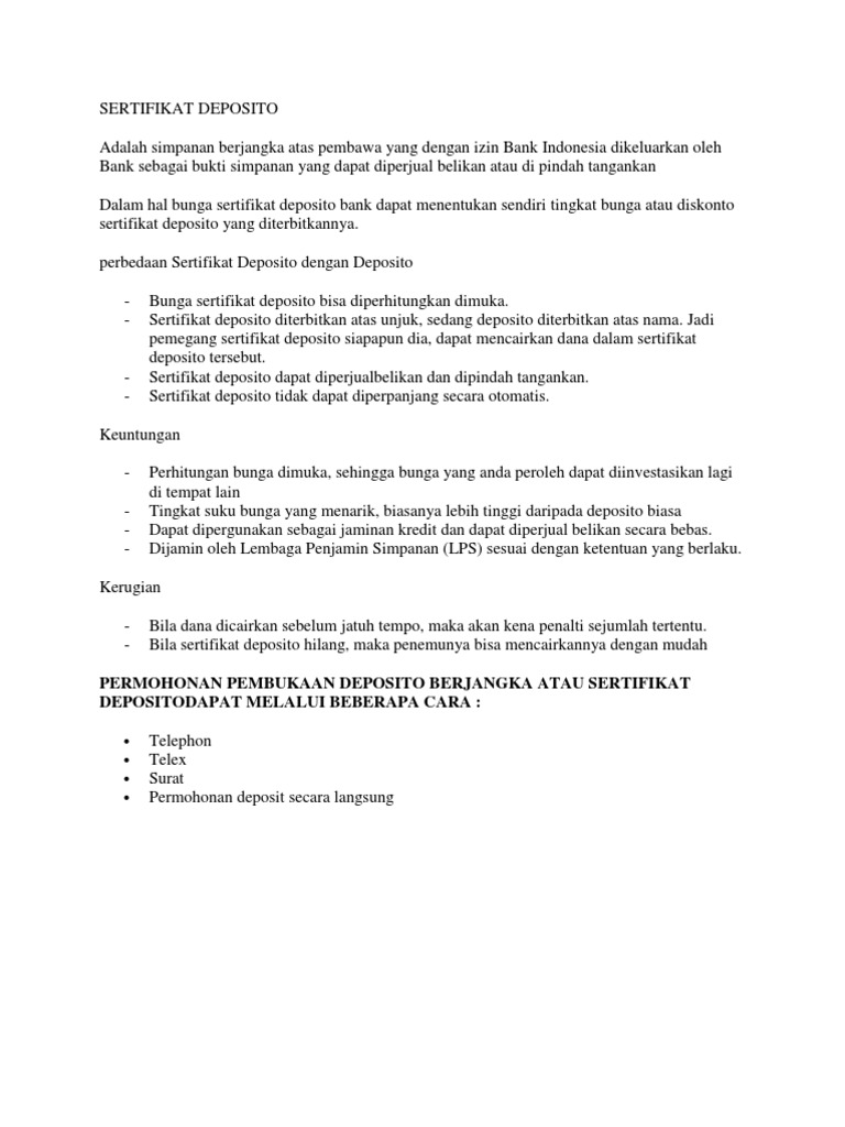 Format Contoh Sertifikat Deposito Berjangka Bank Mandiri ... from gawecv.com "secara prospek, karena penempatannya di deposito dan obligasi yang jatuh tempo di bawah 1 tahun, dengan era bunga rendah saat ini masih menarik bagi investor yang ingin mendapat keuntungan lebih tinggi daripada deposito. Jun 23, 2021 · baca juga artikel yang mungkin berhubungan : Maka pembayaran sewa di tahun kelima. Pengertian sertifikat deposito, deposito berjangka, deposito on call beserta perbedaannya definisi tabungan tabungan sendiri dapat didefinisikan sebagai bagian dari pendapatan tahun ini yang tidak dibelanjakan atau digunakan untuk konsumsi ( nopirin, 1996: Proses pemecahan sertifikat apartemen membutuhkan waktu yang cukup lama, jika dibandingkan rumah, akibatnya anda tidak bisa memanfaatkan sertifikat apartemen, misalnya, mengagunkan ke bank. Jadi, belum pernah mengalaminya secara langsung. Jadi bila anda sebelumnya sudah pernah mengajukan atau melunasi cicilan kta , kartu kredit , kredit mobil , kredit motor , dengan catatan pembayaran yang baik, tentunya peluang anda untuk mendapatkan pinjaman kpr. Jun 09, 2020 · diminta untuk memberikan jaminan berupa sertifikat.